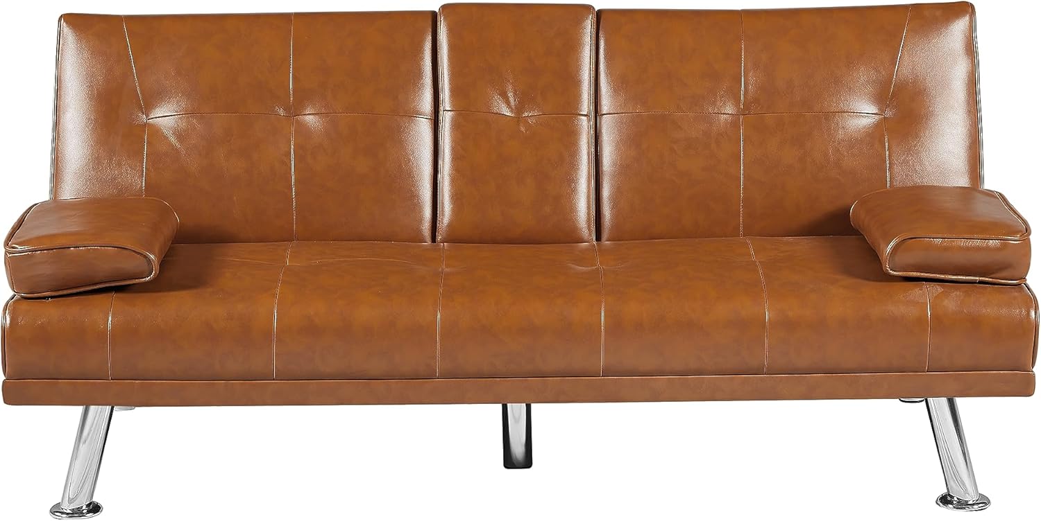 Modern Upholstered Convertible Folding Futon Sofa Bed, Convertible Sleeper Sofa, Couch, Loveseat with Metal Legs,2 Cupholders for Compact Living Space Living Room,Bedroom,Apartment (Beige)(Brown)
